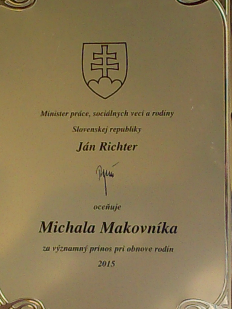 Z rúk Ministra práce, sociálnych vecí a rodiny SR Jána Richtera, prevzal významné ocenenie aj profesionálny rodič Strediska Evanjelickej DIAKONIE Banská Bystrica Domova detí pán Michal Makovník za významný prínos pri obnove rodín. Jeho ľudský a empatický prístup ako aj pracovné skúsenosti ho predurčujú pomáhať tým najzraniteľnejším - deťom, ktorých biologickí rodičia z rôznych dôvodov zlyhali.