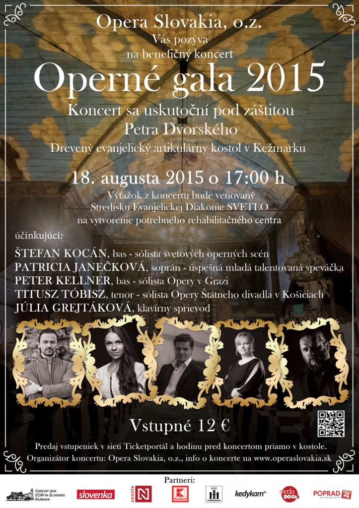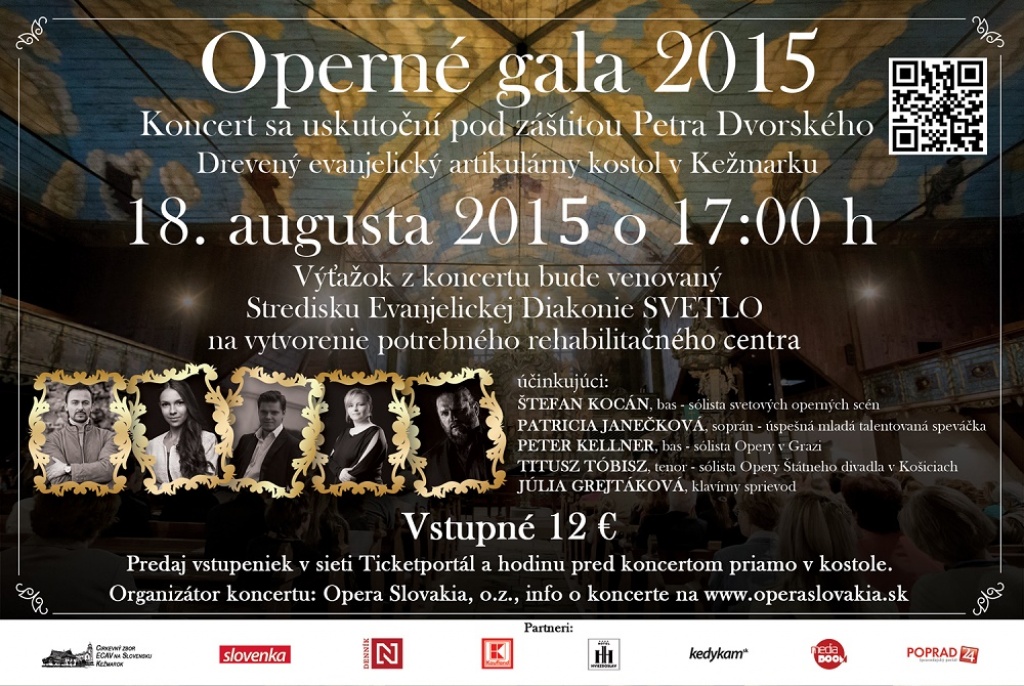 Opera Slovakia, o. z., vás pozýva na operný benefičný galakoncert – Operné gala 2015 v Evanjelickom drevenom artikulárnom kostole v Kežmarku 18. augusta 2015 o 17.00 hod. . Výťažok z koncertu pod záštitou Petra Dvorského bude venovaný Stredisku Evanjelickej diakonie SVETLO na vytvorenie rehabilitačného centra.
