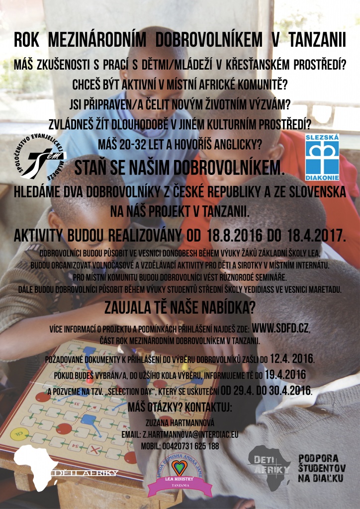 Sliezska diakonia ponúka možnosť českému a slovenskému dobrovoľníkovi pôsobiť na dobrovoľnej službe v dĺžke 8 mesiacov na projekte v Tanzánii.