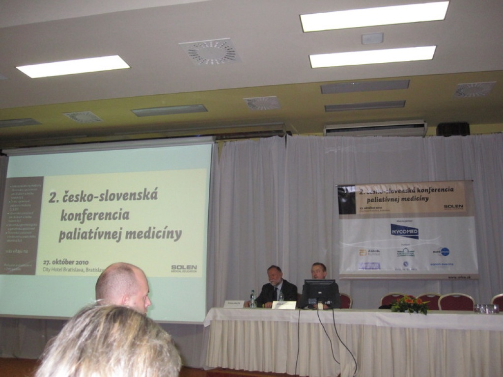 Po prvýkrát sa na Slovensku zišli najmä lekári, ale aj iní odborníci z oblasti paliatívnej a hospicovej starostlivosti ,na spoločnú konferenciu o paliatívnej medicíne a paliatívnej starostlivosti. Konala sa 27.10.2010 v hoteli Bratislava a zúčastnili sa jej spolupracovníci z hospicov a paliatívnych oddelení z celého Slovenska, viacerých miest z ČR a prednášajúcim bol aj lekár z Rakúska. Dušou a srdcom za slovenskú stranu bola najmä pani primárka Križanová, ktorá prednášala o situácii v paliatívnej starostlivosti na Slovensku ako aj o prognózovaní v onkológii. Medzi prednáškami zazneli aj príspevky z paliatívnej starostlivosti u neonkologických pacientov, napríklad v geriatrii, o čom hovoril prof. Krajčík a doktor Mikuš. Lekár Kabelka z ČR nechal poslucháčom vryť do pamäti pojem „geriatrická krehkosť"a zdôraznil, že dnešná doba so starnutím populácie ide proti nám. Cieľom je dostať paliatívnu medicínu (paliare- uľahčovať) tam, kde sú pacienti a nečakať, že oni prídu sami. Je to vysoký cieľ, ktorý chceme dosahovať. Doktor Baumgartner z Grazu okrem iného podal názorné rozdelenie a systém v organizovaní paliatívnej starostlivosti. V diskusii odpovedal na zaujímavú otázku z publika o možnosti čerpania tzv. „hospicovej rodinnej dovolenky" rodinného príslušníka, ktorý sa stará o svojho zomierajúceho člena rodiny, a to od troch do šesť mesiacov, čo prepláca sociálna poisťovňa v Rakúsku. Na konferencii zazneli príspevky o začleňovaní paliatívnej starostlivosti v systéme zdravotnej starostlivosti u nás a v Čechách, čím sa účastníci vzájomne inšpirovali a zdieľali ťažkosti. Skúsenosti z domácej hospicovej starostlivosti pri dospelých ako aj pri detských pacientoch referovali odborníci v jednej z poobedňajších sekcií. V oblasti psychospirituálnych aspektov v paliatívnej starostlivosti zaznievala opakovane potreba efektívnej komunikácie a citlivého načúvania. O napĺňaní spirituálnych potrieb nevyliečiteľne chorých s konkrétnymi skúsenosťami hovorila Mgr. Prášilová z Evanjelickej Diakonie, ktorá pôsobí pri pacientoch na paliatívnom oddelení v Národnom onkol. ústave. Zaznelo, že v posledných dňoch terminálneho štádia pacient nepotrebuje veľa ľudí okolo seba, dokáže si zväčša vybrať jedného zo svojich najbližších, ktorého chce mať pri sebe a bude potrebovať čoraz menej vecí. Ak sa stane, že bude zmierený so smrťou, navonok to môže vyzerať, že sa „odtiahol", „odcudzil od živých" a tak už je „nasmerovaný na druhý breh", pričom používanie symbolického jazyka je časté. Od českých kolegov zaznela možnosť zaradenia a funkcie tzv. edukačnej sestry v rámci poskytovania onkologickej starostlivosti v nemocnici a v neposlednom rade účastníci počuli opäť o dôležitej potrebe multidisciplinárneho prístupu v hospici.